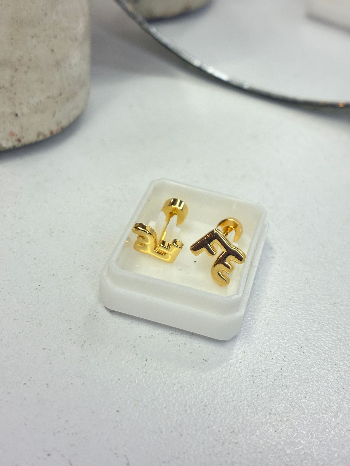 Lleva siempre contigo un recordatorio de fortaleza y esperanza con este arete FE elaborado en acero inoxidable dorado.